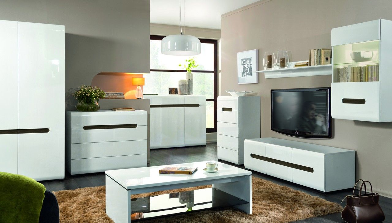 Коллекция выполнена в современном стиле с отсылками к минимализму: белые глянцевые фасады, интегрированные ручки, закругления по верхнему и нижнему краю дверей, контрастные рифленые вставки цвета Дуб венге Магия.
