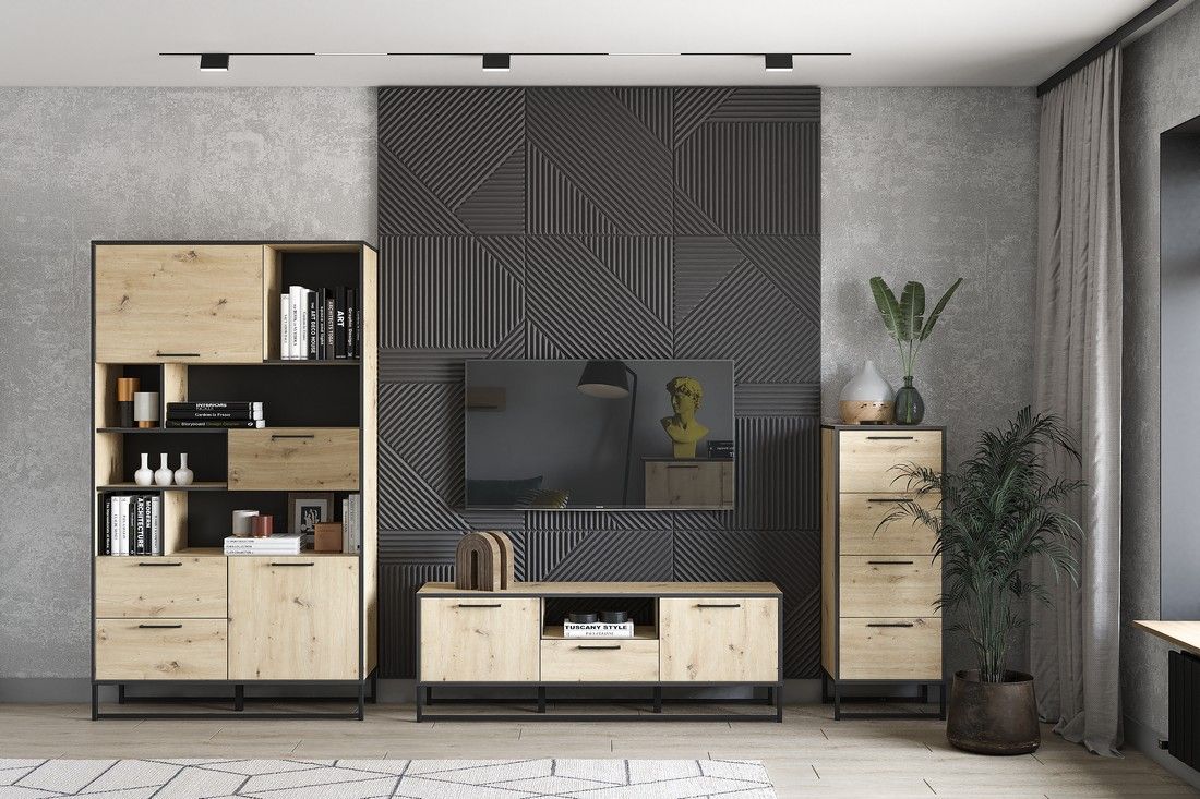 Яркий пример того, как мебель, выполненная в индустриальном стиле, не отталкивает, а наоборот — вдохновляет на новые идеи и свершения. Корпус и фасады в натуральном древесном оттенке дуб артизан, темная кромка и матовые черные ручки, геометричность, прямые линии, нестандартные функциональные решения — и ни один ценитель современного интерьера не останется равнодушным.